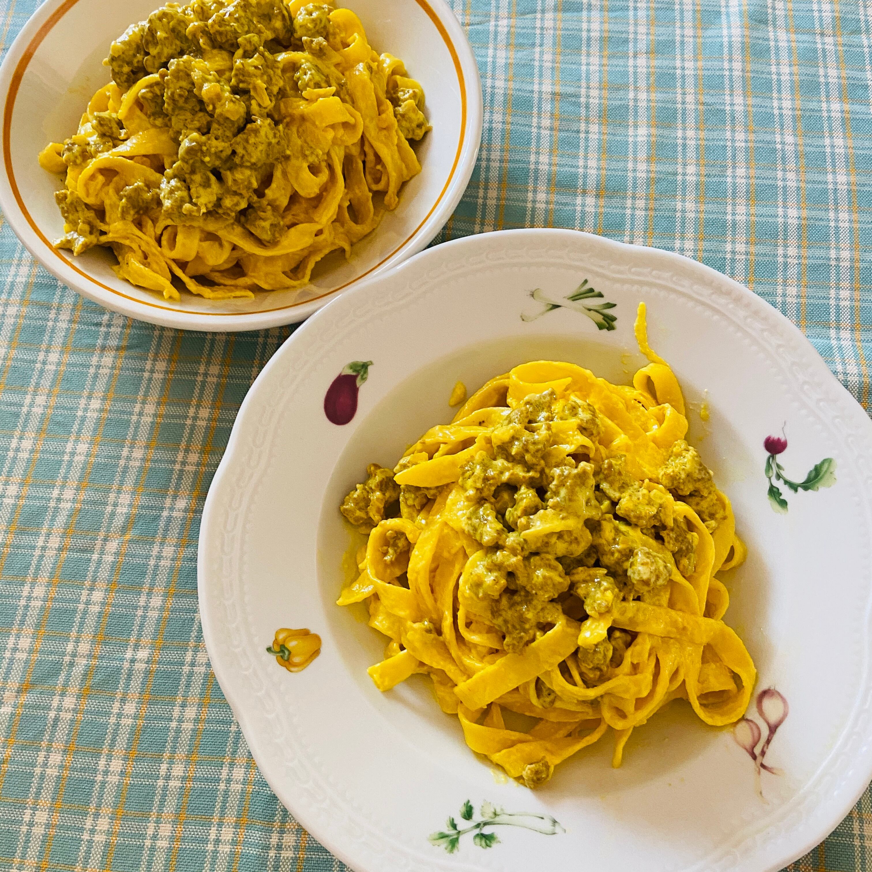 ソーセージの脂と濃厚なサフランクリームをロングパスタに絡ませて召し上がれ!