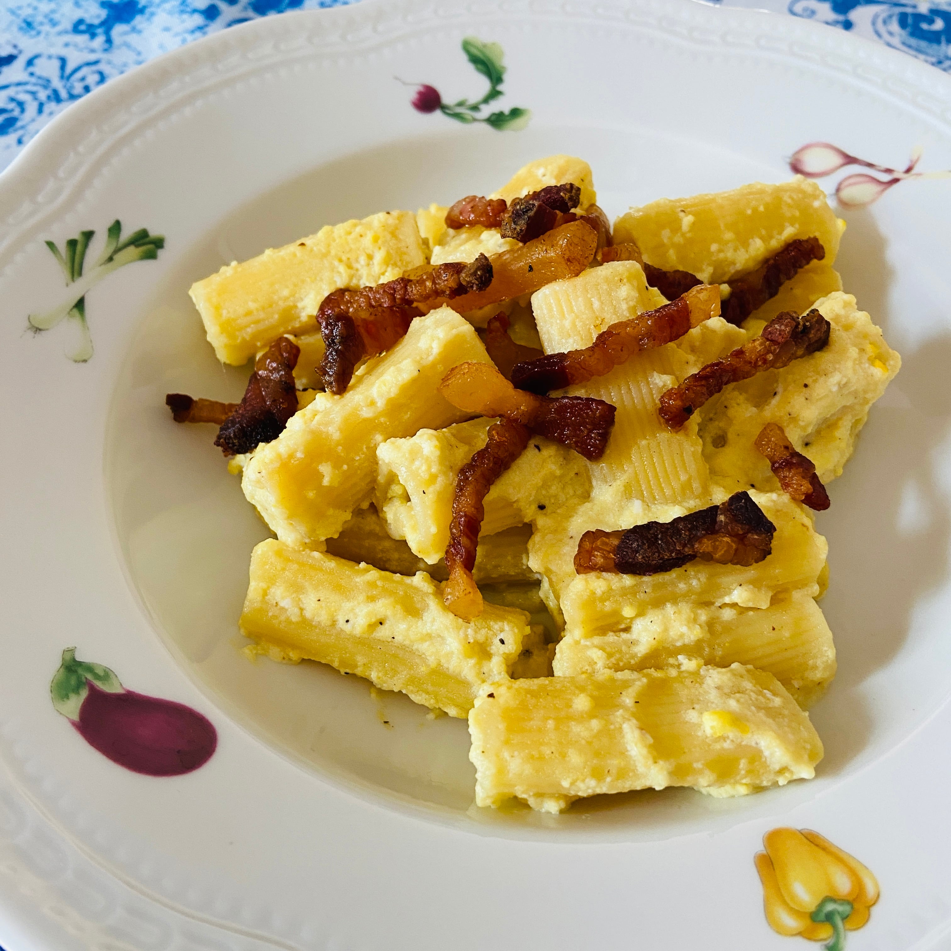 カルボナーラはグアンチャーレとペコリーノ、卵でクリーミーなソースを作りますが、ローマの家庭の多くでは、生卵を使うのを避けるために、なんと茹で卵で作るそう!!