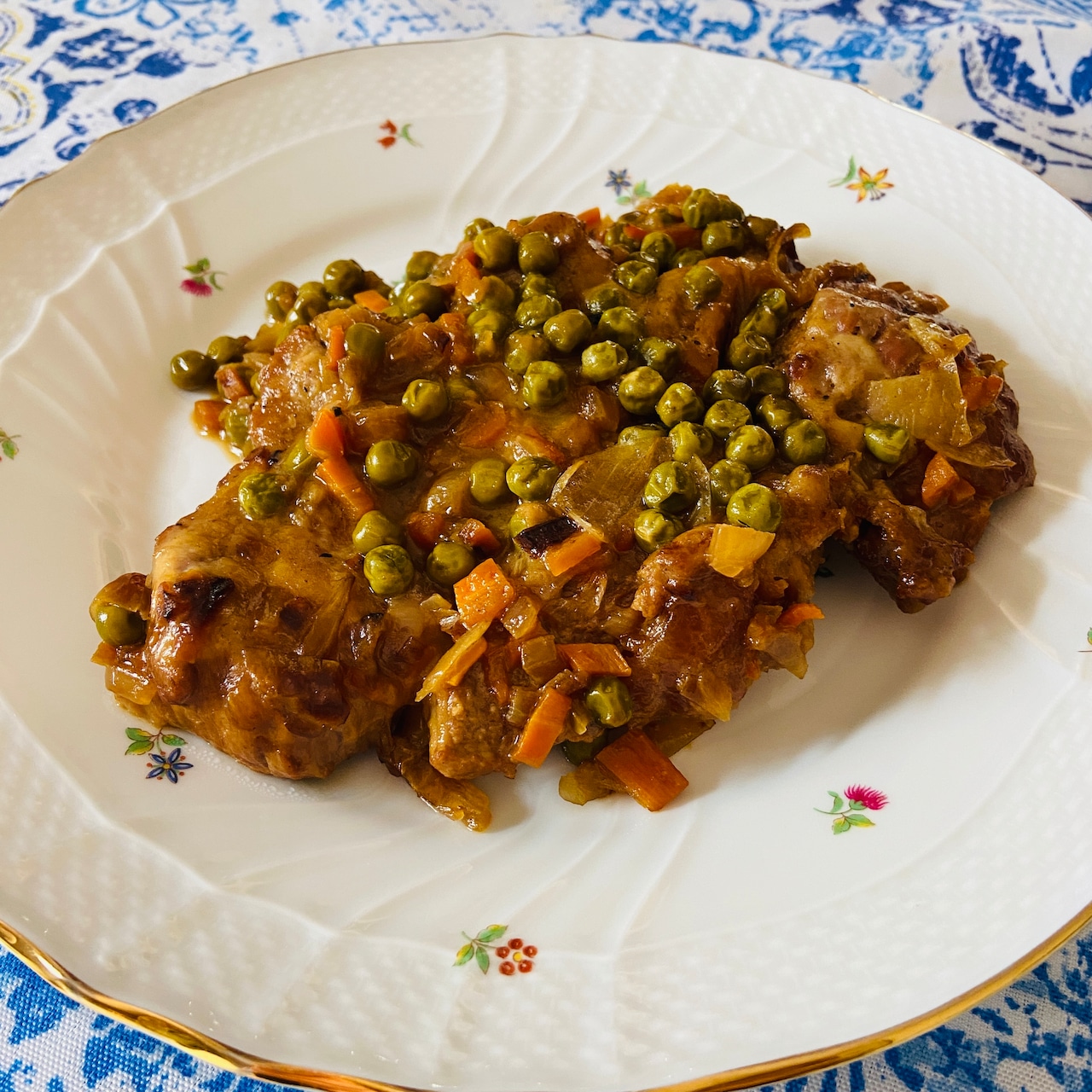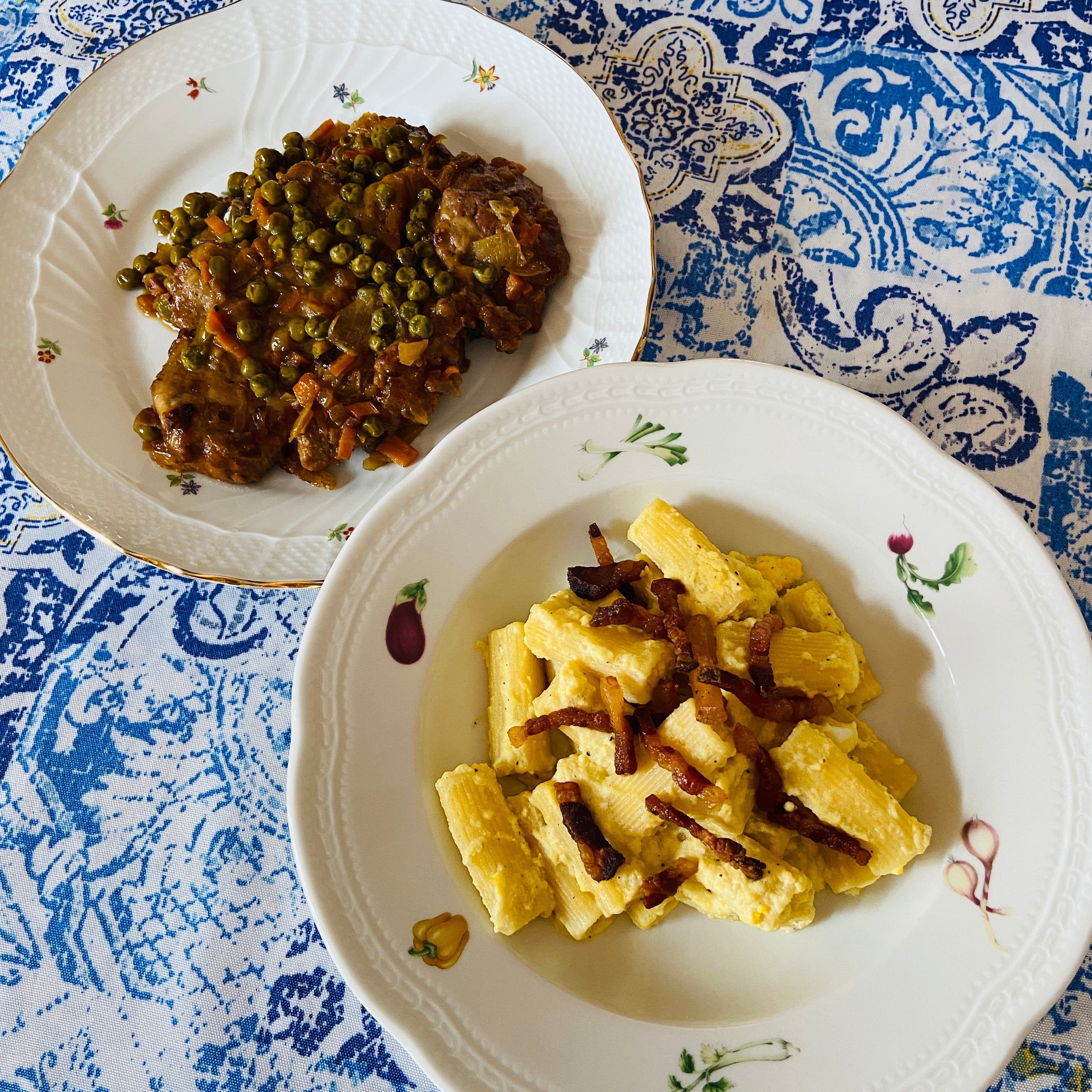 「ローマ料理☆家族のカルボナーラ&オッソブーコのグリーンピース煮込み」
