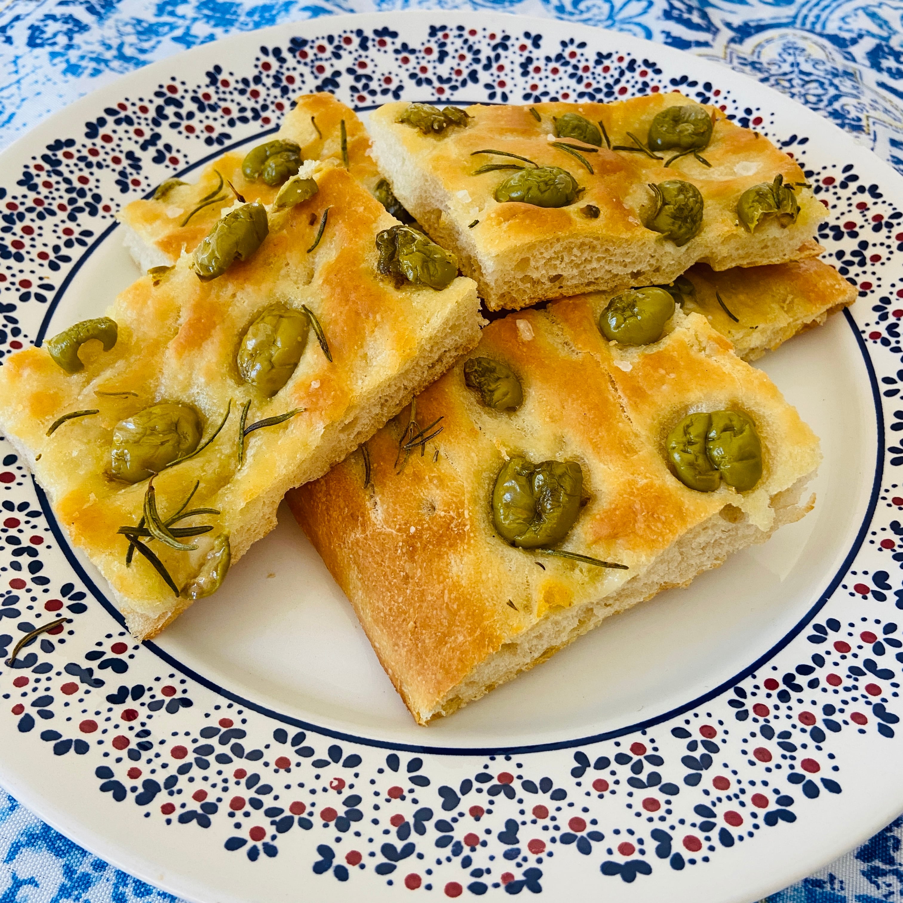 オリーブオイルがたっぷり、カリッと焼き上げたフォカッチャ、今回はオリーブとローズマリーを載せてアクセントに。