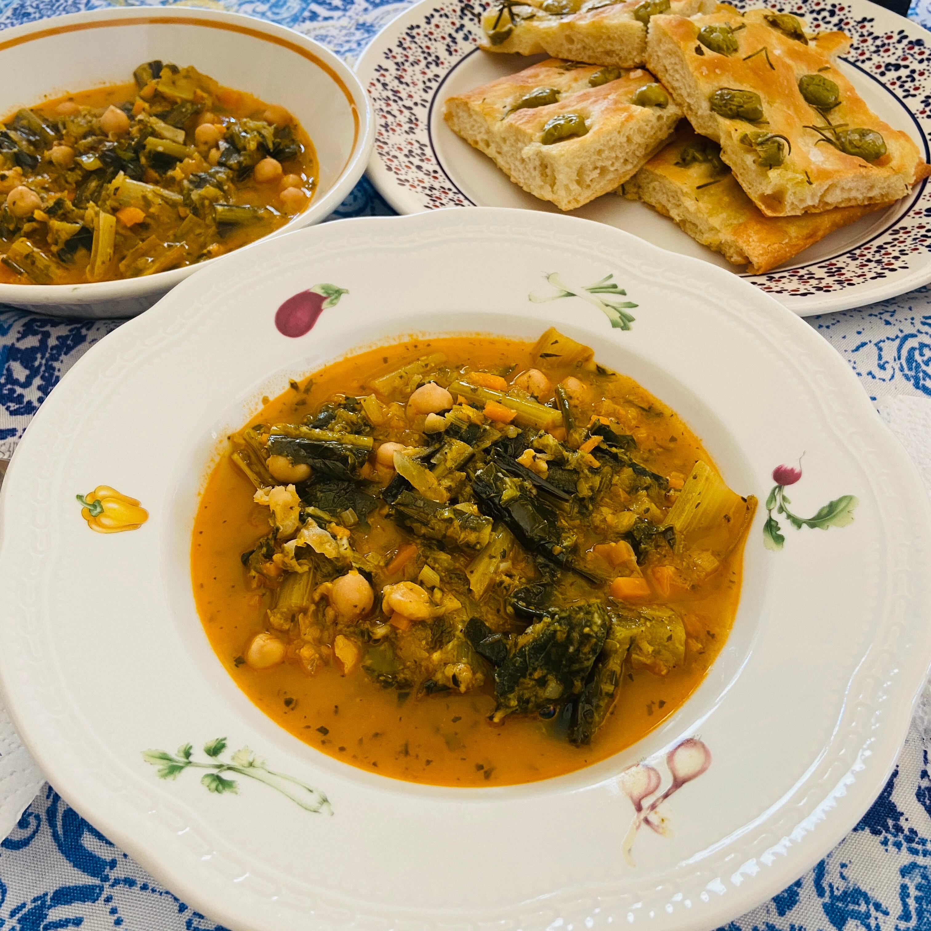 「秋のトスカーナ料理☆チコリーと豆の農民スープ&オリーブとローズマリーのスキアッチャータ」