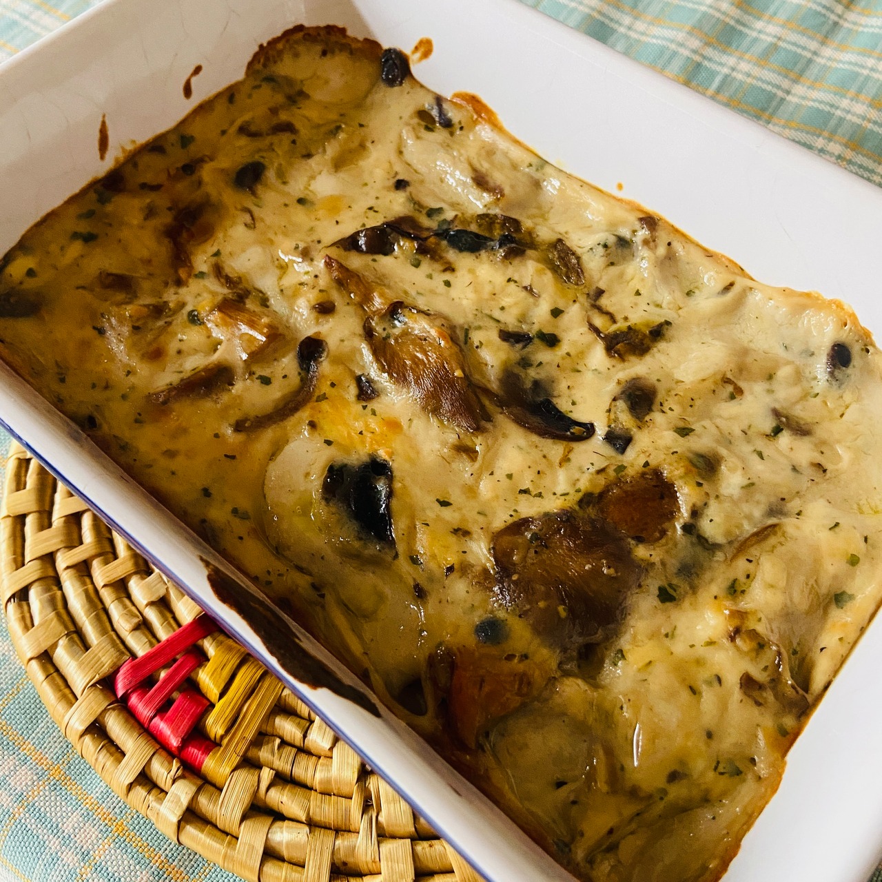 濃厚なペシャメルにキノコを混ぜ、最後はオーブンで焼き上げます。
