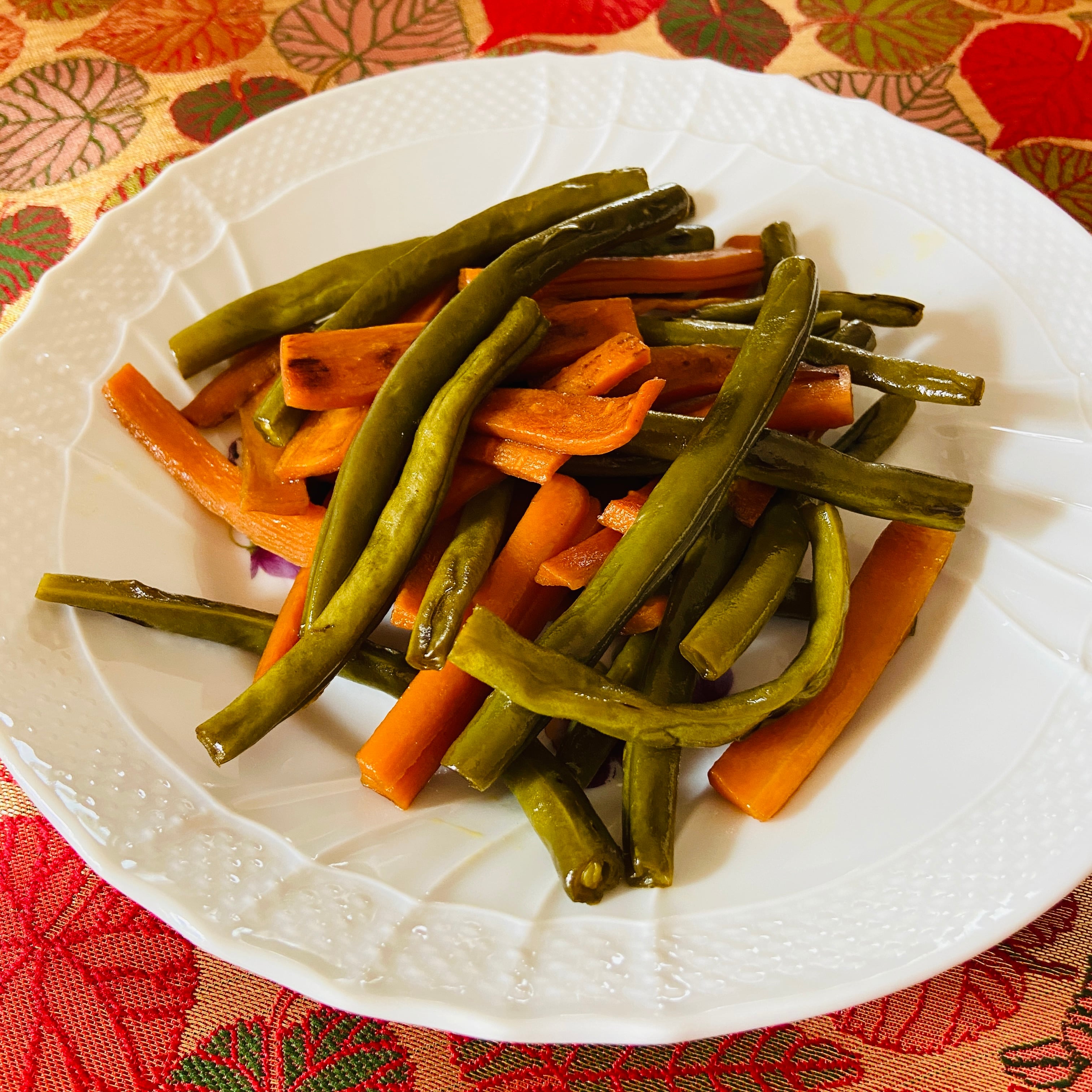 付け合わせに「ニンジンとインゲンのバルサミコバターソテー」を。