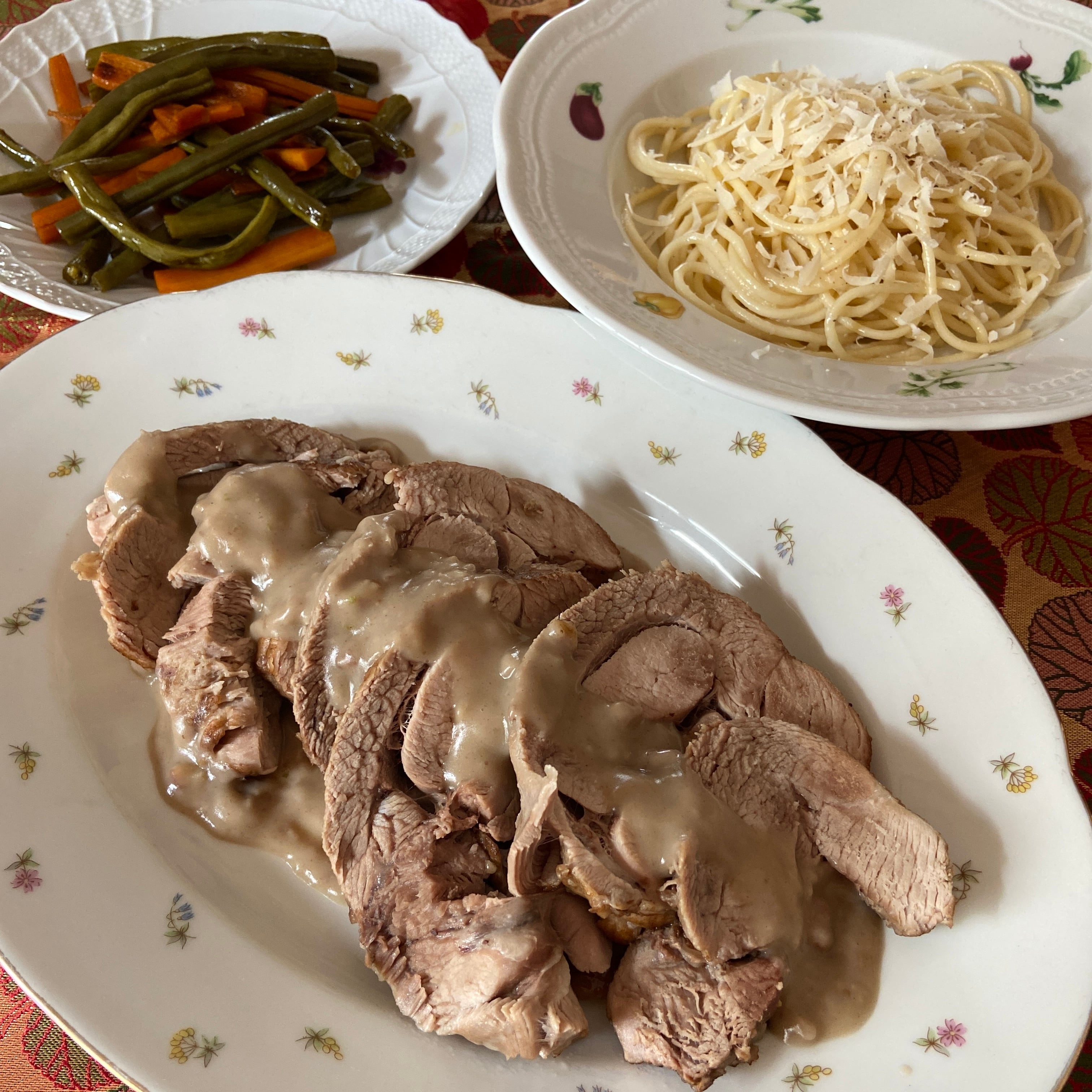 「栗ソースの豚肉のアロスト&マンマ・アントネッラの黄金のバタースパゲティ」