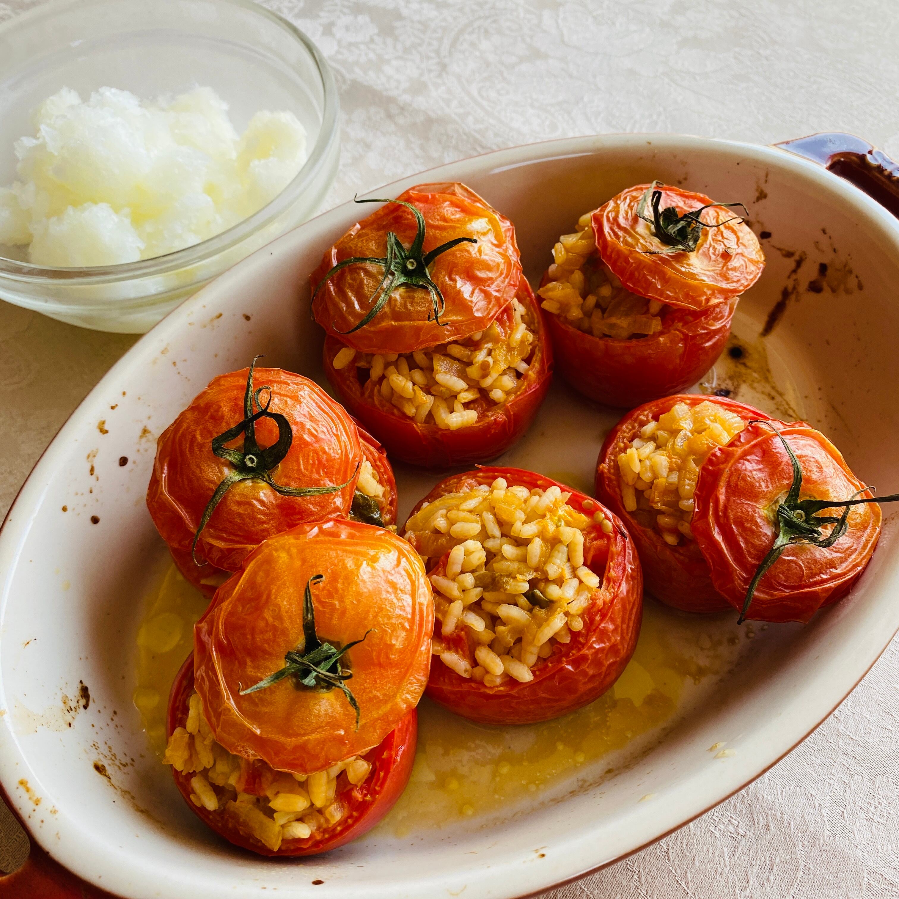 トマトのリピエノは、くり抜いたトマトにシンプルなリゾットを入れて焼いた一品、