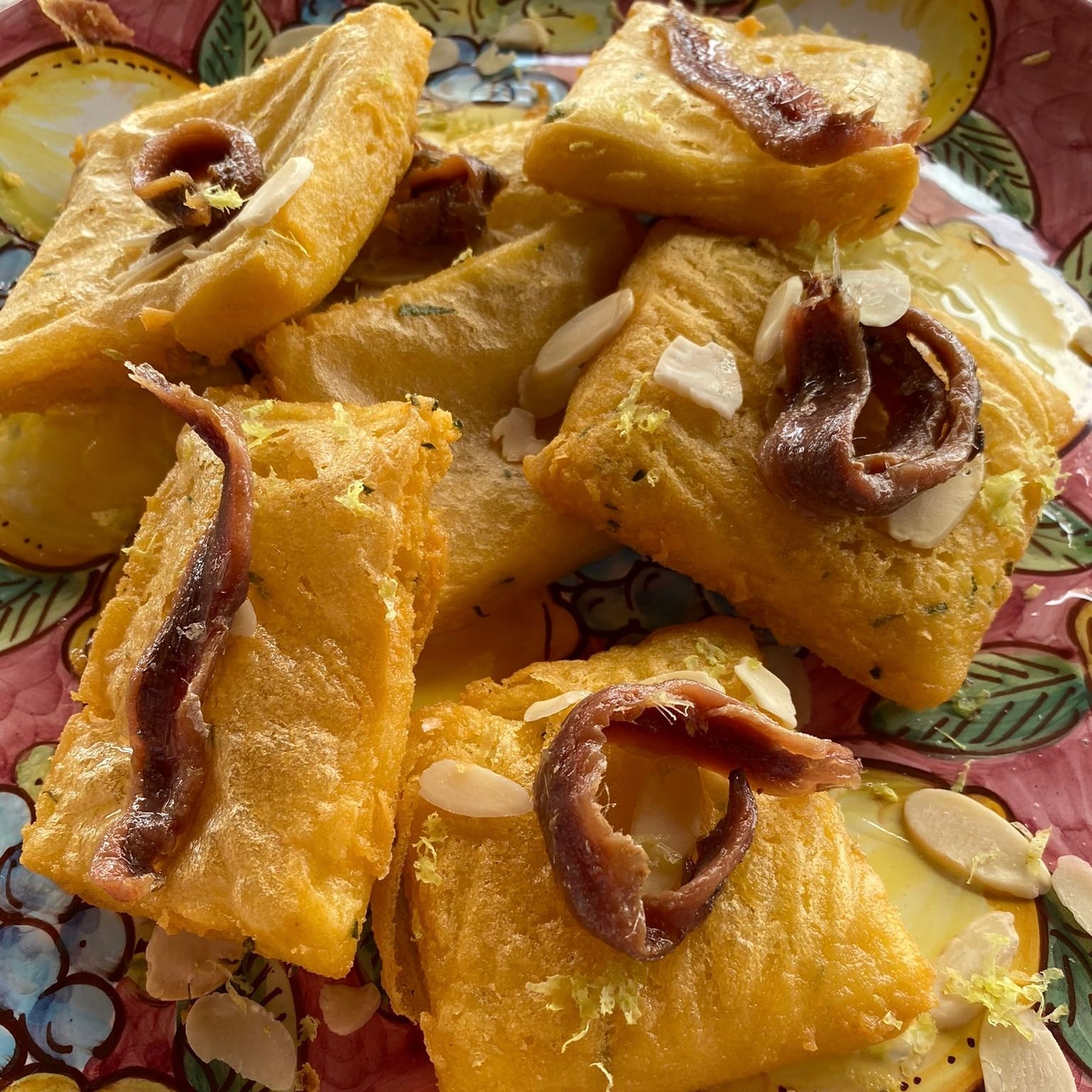 料理デモのメニュー:パネッレ、アーモンドパスタ、イワシのタルティーノ、グラニタ