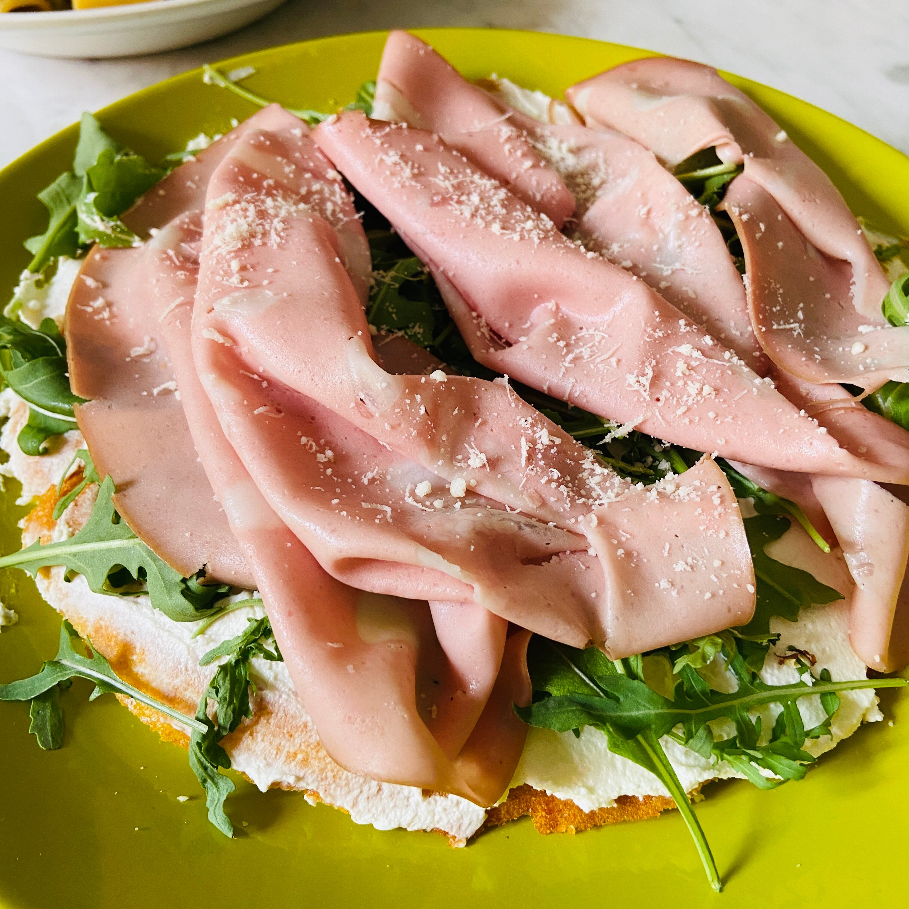 リコッタをたっぷり含んだしっとりした生地を焼き、上にサラミを載せて完成。