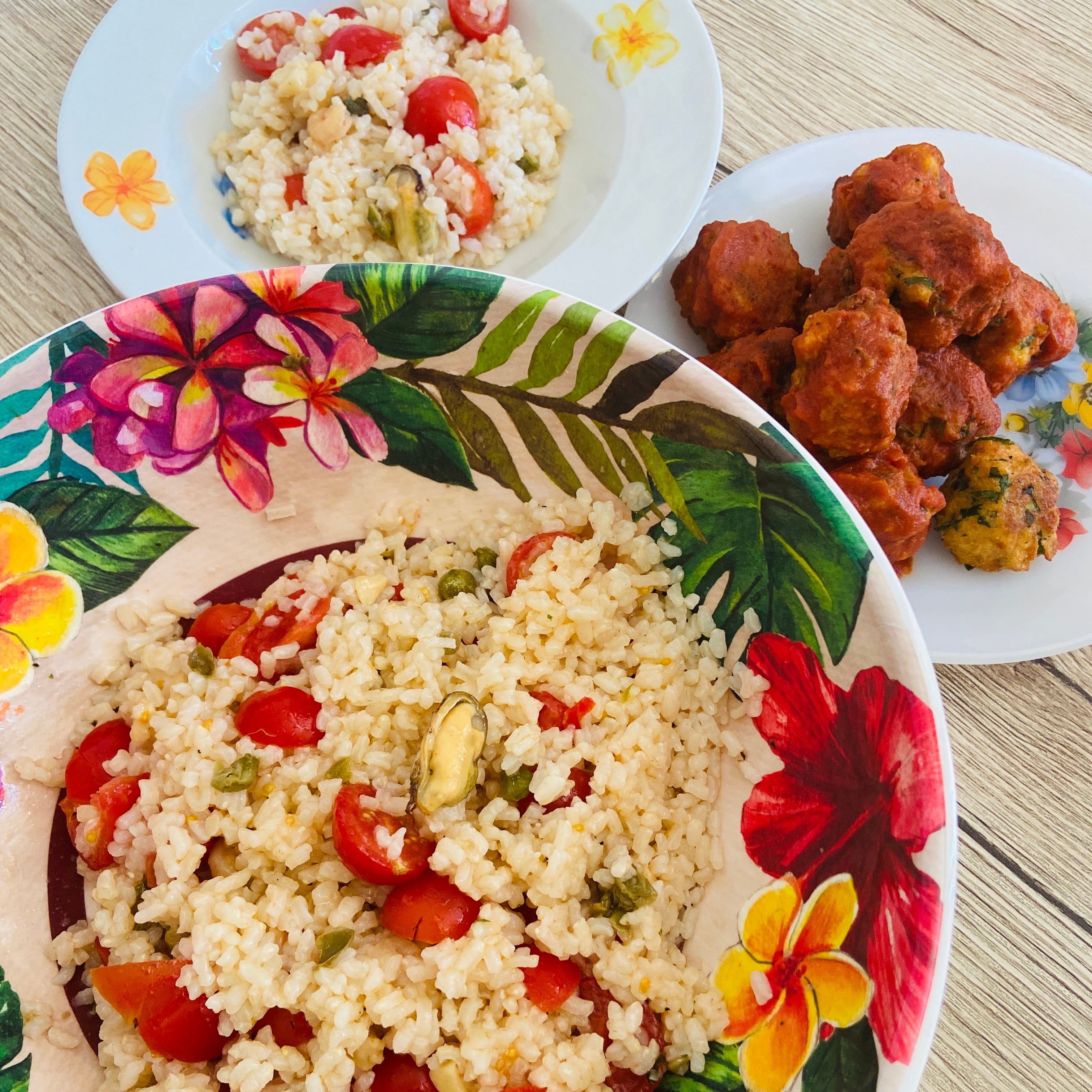 「海の幸のインサラータ・リーゾ&卵チーズボール」